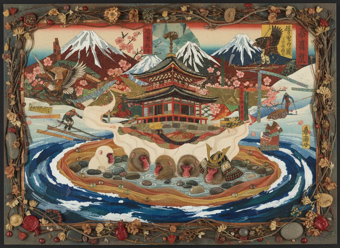 Alpenregion mit Skigebieten, Zenko-ji-Tempel und in Onsen badenden Schneeaffen.