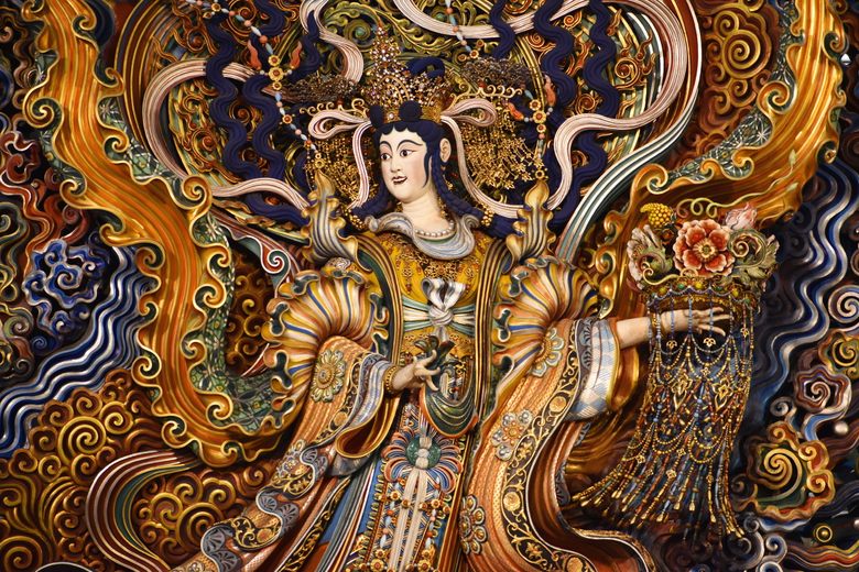 Die „Magokoro Tennyo“, oder „Göttin der Aufrichtigkeit“, ist eine monumentale Skulptur, die sich in der Hauptfiliale des Mitsukoshi-Kaufhauses im Tokioter Stadtteil Nihonbashi befindet. Dieses 11 Meter hohe, 6,8 Tonnen schwere Meisterwerk, das über ein Jahrzehnt von Künstler Gengen Sato aus 500 Jahre altem Hinoki-Zypressenholz geschaffen wurde, symbolisiert den Kernwert des Geschäfts: Aufrichtigkeit. Verziert mit über 12.000 Juwelen, darunter Diamanten, Jade und Achat, stellt sie eine „Tennyo“ (ein weibliches Geistwesen aus der japanischen buddhistischen Mythologie) dar, die aus den Wolken herabsteigt, begleitet von einem Phönix, inmitten aufwendiger floraler Designs und flammenartiger Wellen.